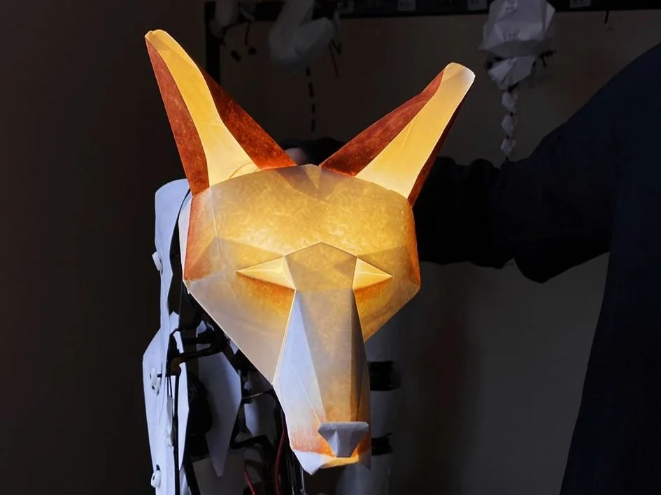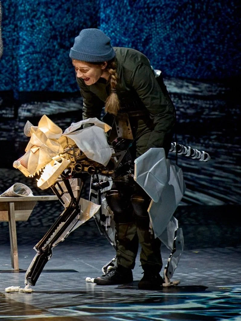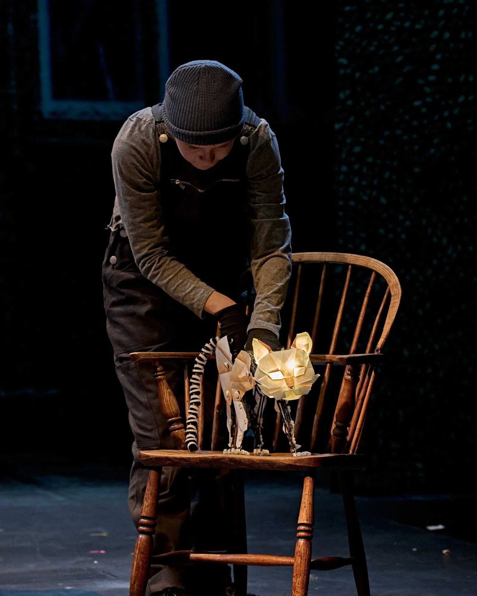 The Book of Dust- La belle Savage was a production at The Bridge Theatre 2022. It was based on the book by Philip Pullman and directed by Nick Hytner. The deamons were represented through puppetry and I worked with puppetry director Barnaby Dixon, producer Glenn Holberton and graduates from Bournmouth Arts University on the design, fabrication and maintenance of 36 puppets. The design language was inspired by the craft of origami and we lit them from the inside to represent their soul like quality.